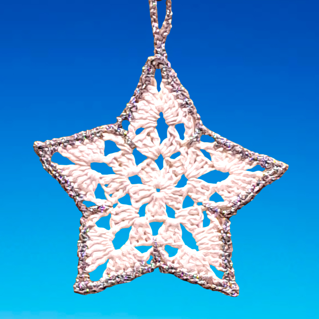 Etoile blanche au crochet, au bord argenté amidonné
