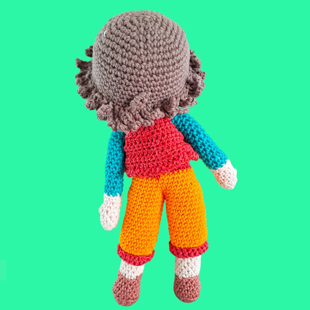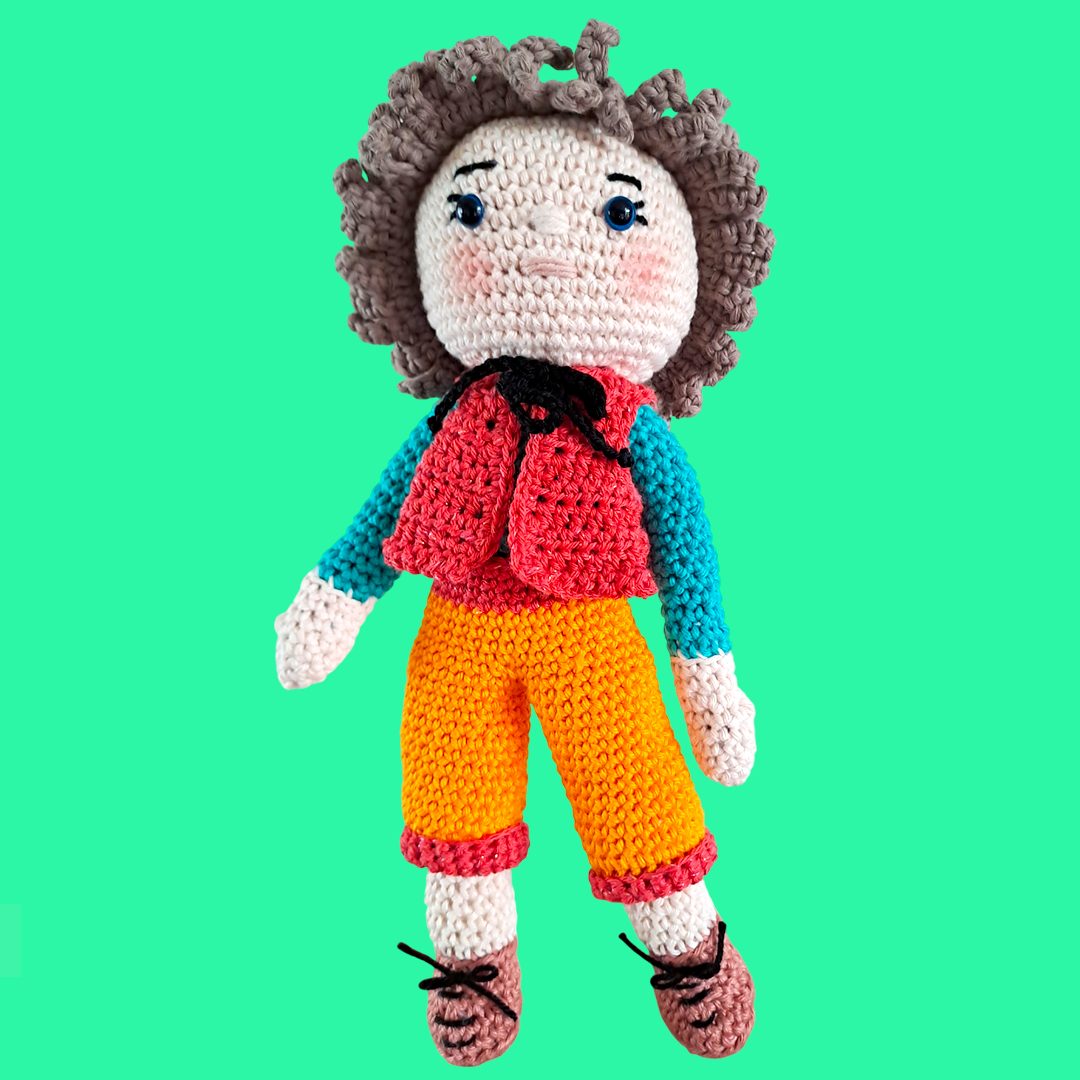 Garçon au gilet rouge et pantalon jaune, réalisé au crochet et articulé