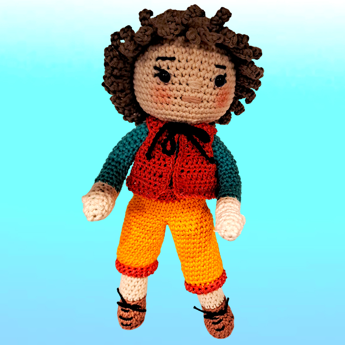 Garçon réalisé au crochet, au pantalon orange et gilet rouge, manches vertes et chaussons marron