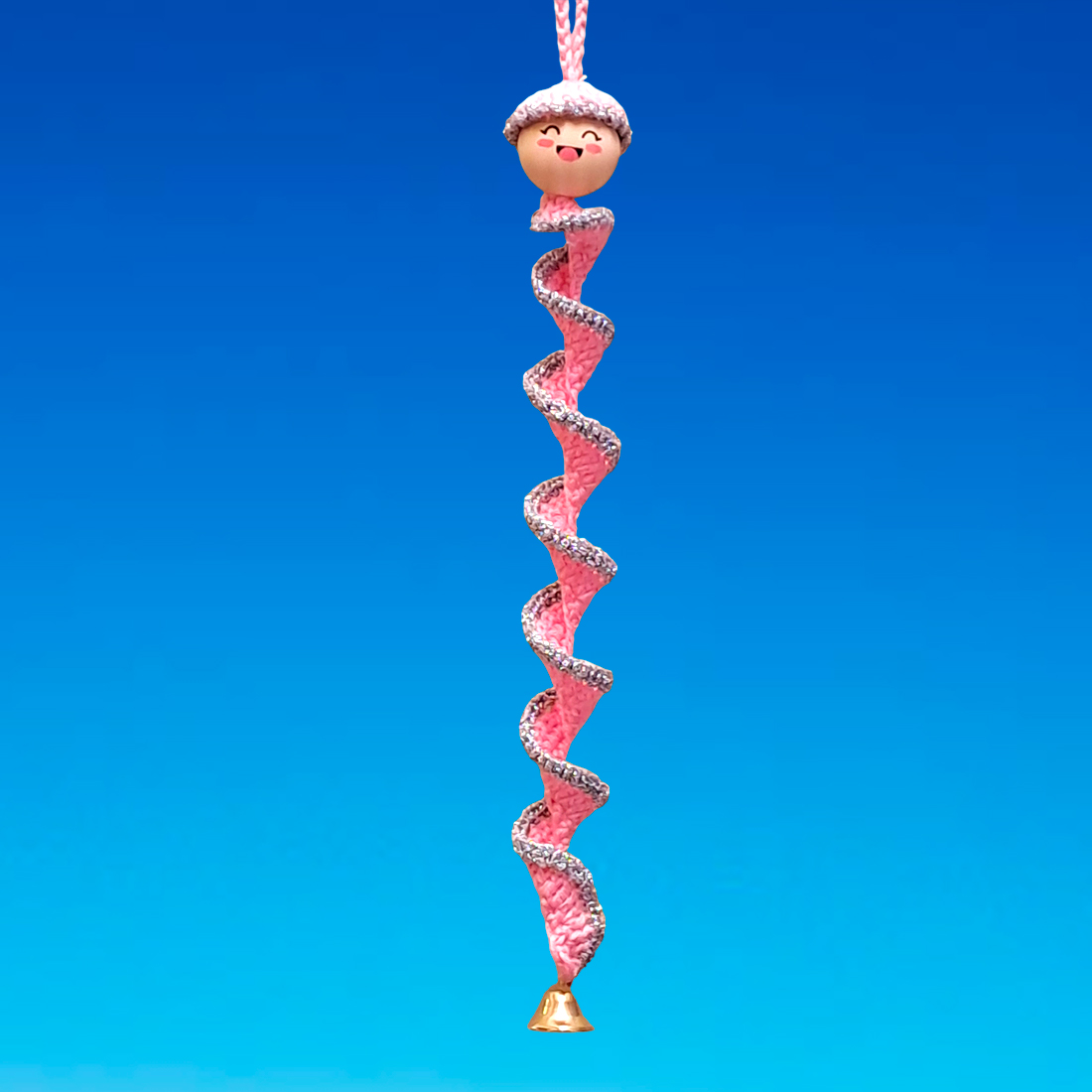 Guirlande rose au bord argenté avec tête en bois et cloche dorée
