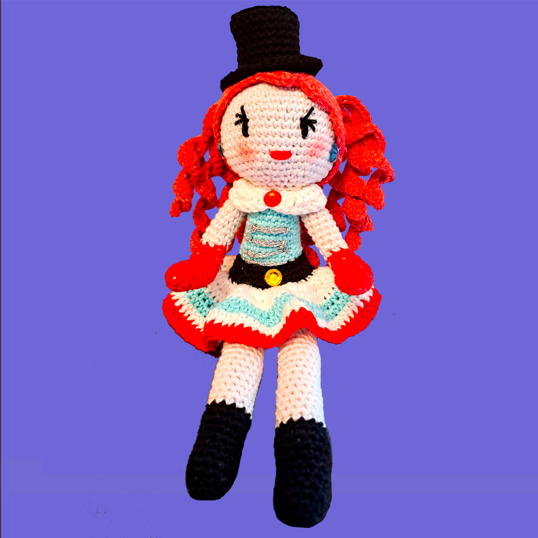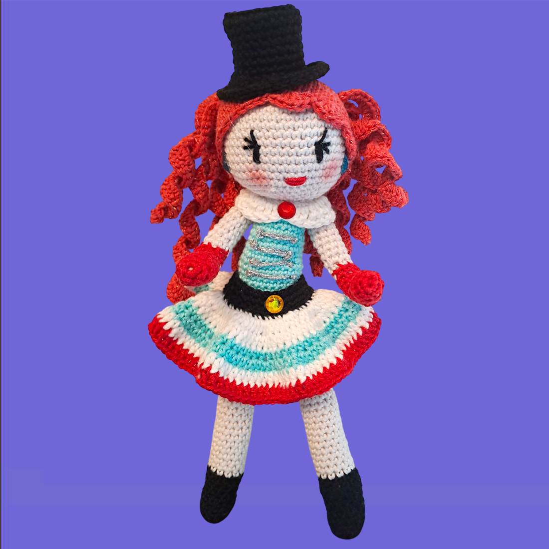 Poupée rousse à la robe tricolore et chapeau noir, réalisée au crochet