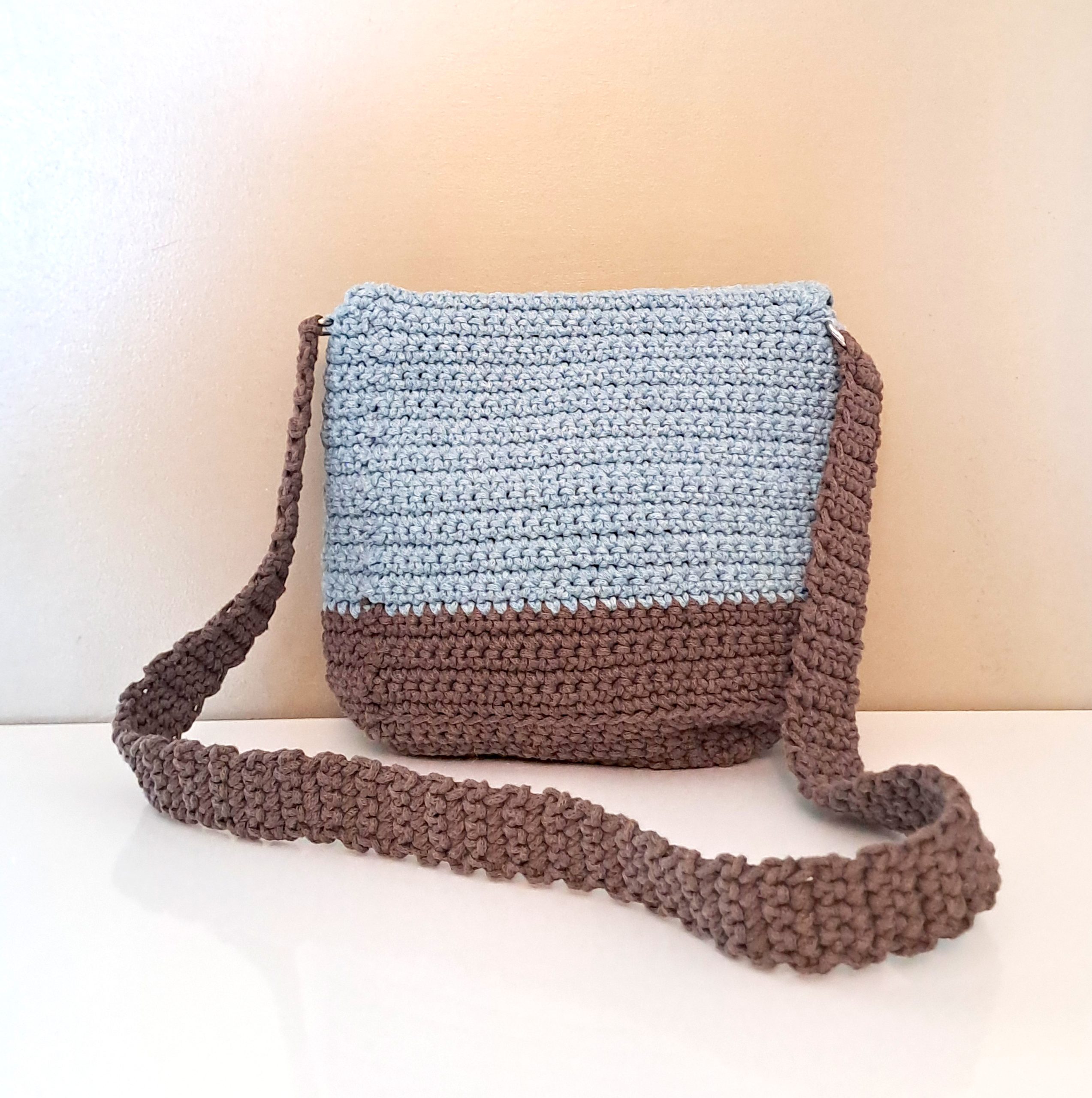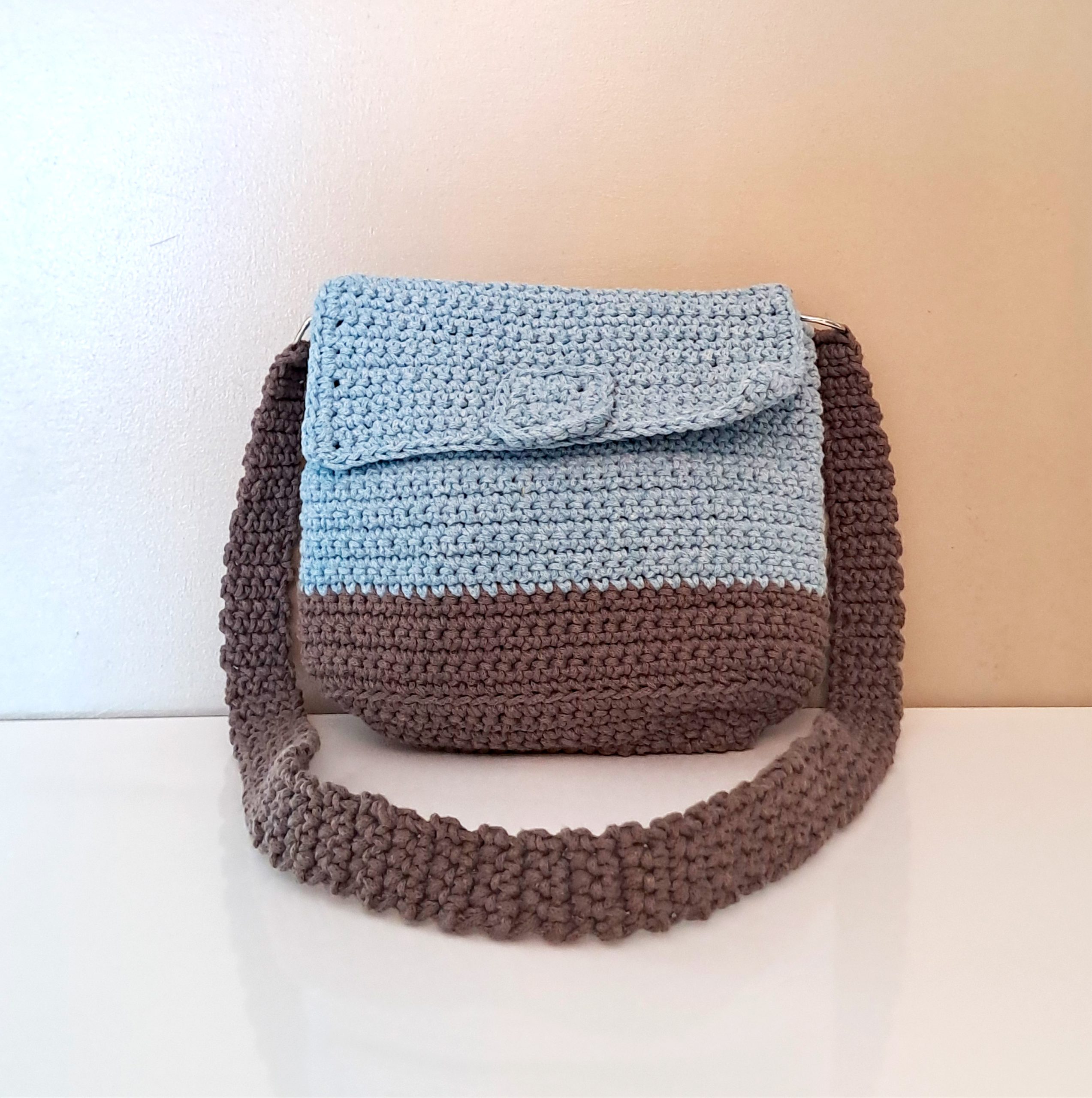 Sac à main au crochet coton bleu et marron, fermeture pression aimantée